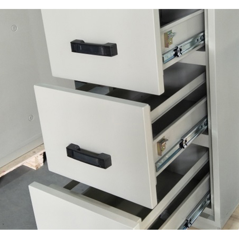 五:抽屜之間配連鎖裝置:用戶如不需要每個(gè)抽屜均配置獨(dú)立聯(lián)鎖,可開啟聯(lián)鎖功能,由一把鎖控制全部抽屜。我公司產(chǎn)品出品時(shí)已經(jīng)啟用聯(lián)鎖裝置。聯(lián)鎖裝置位于每節(jié)抽屜圍板右側(cè)。